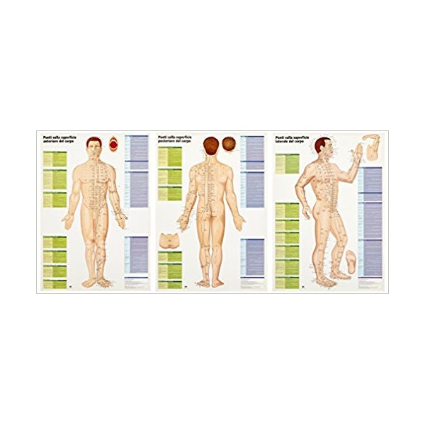 Le tre mappe a colori in formato poster (70 X 100) riassumono le informazioni relative ai punti e ai meridiani principali individuati sul corpo umano rappresentato in vista frontale, laterale e dorsale. Sul lato sinistro di ciascuna mappa sono inoltre riportate le principali funzioni e utilizzi in patologia per ciascun meridiano, nonché le sigle OMS e francesi. Sul lato destro delle mappe compaiono invece le azioni relative ai punti di comando, ai punti specifici e ad altri punti particolarmente importanti.