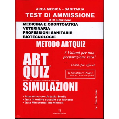 13000 quiz ufficiali e inediti, suddivisi per materia e mescolati casualmente. Interattivo con Artquiz Studio grazie al Correttore che riporta anche la numerazione dei quesiti come elencati nel volume Studio, "riprendi" gli errori fatti con le Simulazioni nel volume Studio per fare ancora più punti al Test! Registra i codici dei volumi Artquiz Studio e Artquiz Simulazioni per accedere gratuitamente al software il Simulatore. Sul sito di Artquiz trovi indicazioni dettagliate sul Metodo Artquiz, come studiare e sfruttare al massimo i volumi Artquiz (si consiglia una lettura attenta), sulla registrazione dei codici per l'accesso gratuito al Simulatore e relativa guida all'uso e l'indice di Artquiz Studio. Il Metodo Artquiz consente di studiare i quesiti in modo sistematico per singolo argomento, di eliminare la difficoltà della loro gestione e di migliorare l'apprendimento e la memorizzazione dei concetti richiesti dai quiz sin da una prima lettura, quindi di verificare la propria preparazione e di colmare le proprie lacune con la necessaria teoria di riferimento. Unica e personale è la tecnica di redazione dei volumi Artquiz: l'interattività del volume Artquiz Studio con Artquiz Simulazioni e la complementarietà con Artquiz Teoria (manuale di sola teoria avente lo stesso indice del volume Studio) rendono i manuali Artquiz lo strumento più efficace, pratico e mirato al superamento del Test di Ammissione.