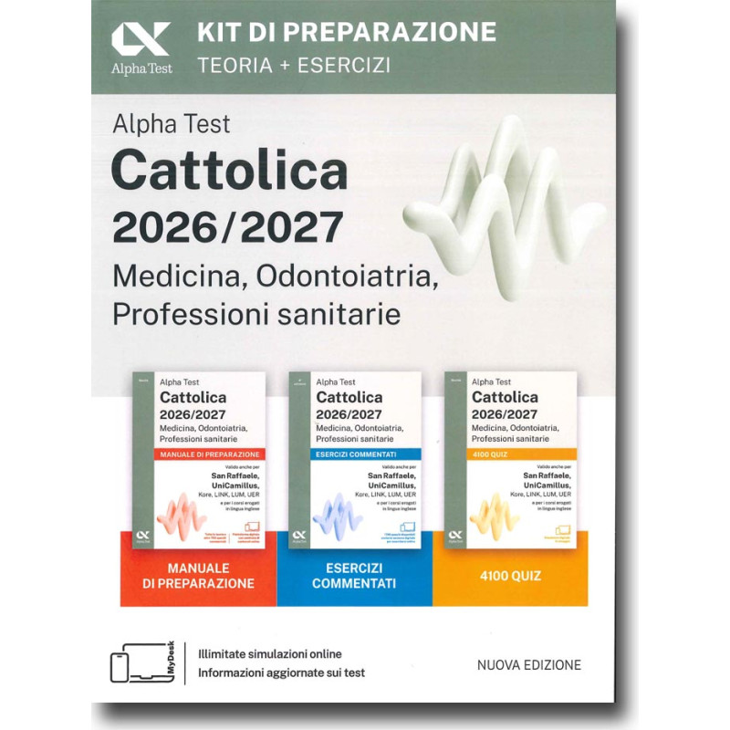 Questo kit è composto da tre volumi e offre un percorso completo per affrontare con successo i test di ammissione a Medicina, Odontoiatria e Professioni sanitarie presso le principali università private: Cattolica, San Raffaele, UniCamillus, Kore, LINK, LUM e UER. Il manuale raccoglie tutta la teoria essenziale per studiare e ripassare ogni argomento richiesto nei test. L'eserciziario propone 1700 domande commentate, suddivise per materia e argomento, per verificare e consolidare le conoscenze. La raccolta di quesiti 4100 quiz consente un'ampia esercitazione e include anche l'accesso online per creare simulazioni illimitate. Il kit è uno strumento indispensabile per affrontare con metodo e sicurezza tutte le prove. Aggiornamento: i volumi sono aggiornati alle ultime novità dei test delle università non statali, con contenuti rivisti secondo i più recenti programmi delle prove di ammissione. Destinatari: ideale per candidati ai test di Medicina, Odontoiatria e Professioni sanitarie organizzati dalle università private Cattolica, San Raffaele, UniCamillus, Kore, LINK, LUM e UER.