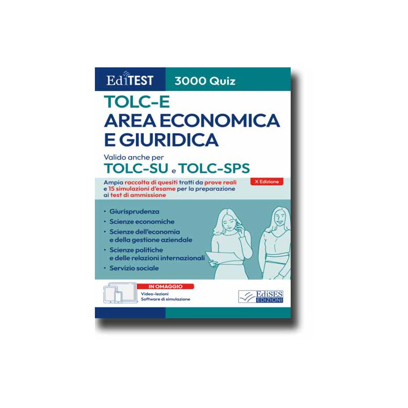 La nuova raccolta di quiz per la preparazione al test di ammissione 2026 ai corsi di laurea di Area economica e giuridica (Scienze economiche, Scienze dell'economia e della gestione aziendale, Giurisprudenza, Scienze Politiche, Scienze del servizio sociale, TOLC-E, TOLC-SU, TOLC-SPS) raccoglie numerosi quesiti, tratti in parte dalle prove svolte negli ultimi anni, che vertono sull’intero programma d'esame favorendo uno studio sistematico di tutte le materie previste (Logica, Cultura generale, Matematica, Inglese) e un’agevole assimilazione dei concetti. Un’ampia parte del volume è poi dedicata a una serie di prove simulate, simili per struttura e composizione ai test ufficiali del Cisia per Economia (TOLC-E), per Giurisprudenza (TOLC-SU), per Scienze politiche (TOLC-SPS) e per la prova di conoscenza della lingua Inglese, utili per esercitarsi nella soluzione di quiz analoghi a quelli realmente somministrati e per una verifica trasversale delle conoscenze. Grazie alla suddivisione dei quiz per argomento, il libro consente di verificare il proprio livello di preparazione e individuare senza difficoltà le proprie lacune, così da procedere a uno studio mirato della parte teorica.