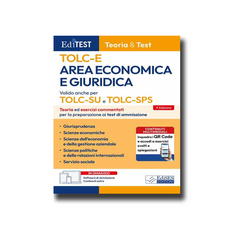 Il nuovo manuale per la preparazione ai test di ammissione 2026 ai corsi di laurea di Area economica e giuridica (Economia, Giurisprudenza, Scienze economiche, Scienze dell'Economia e della gestione aziendale, Scienze Politiche, Scienze del servizio sociale, TOLC-E Economia, TOLC-SU Giurisprudenza, TOLC-SPS Scienze Politiche) offre una preparazione completa su tutto il programma, dando ampia importanza non solo all’acquisizione delle nozioni ma anche alla fase esercitativa.