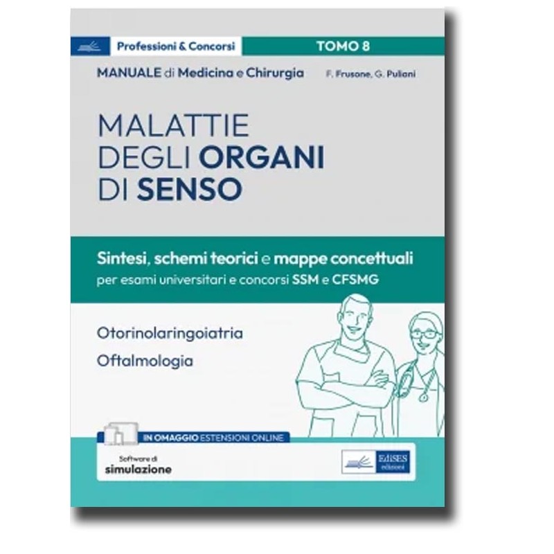 Il tomo 8 del Manuale di Medicina e Chirurgia è stato pensato per agevolare il processo di memorizzazione delle basi teoriche di cui può aver bisogno un medico che debba prepararsi per le selezioni del Concorso nazionale per le Scuole di specializzazione o del Corso di formazione specifica in Medicina generale. Interamente a colori, ricco di illustrazioni, è caratterizzato da una trattazione per punti chiave, con tabelle e schemi di sintesi, in accordo con le nuove metodologie didattiche che ricorrono a tecniche innovative per favorire l’apprendimento degli argomenti. Inoltre, un cospicuo numero di quiz a risposta multipla consente la verifica delle conoscenze acquisite. Oggetto del volume sono le malattie degli organi di senso. Due sezioni compongono il tomo: Otorinolaringoiatria e Oftalmologia. La prima presenta brevemente l’anatomia e la fisiologia degli organi di senso interessati, oltre che la semeiotica fisica e strumentale, e ne illustra le principali patologie, vedi le patologie dell’orecchio e dell’equilibrio, le patologie del naso, del cavo orale e dell’orofaringe, della laringe e dell’ipofaringe. La seconda sezione presenta l’anatomia e l’embriologia dell’occhio e ne tratta tutte le principali patologie tra cui i vizi di rifrazione, le patologie retiniche, del nervo ottico, della congiuntiva, della cornea, del cristallino, non senza averne introdotto prima l’anatomia e la fisiologia.