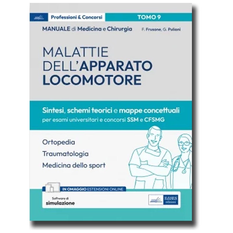 Il Tomo 9 del Manuale di Medicina e Chirurgia si rivolge ai medici che vogliono prepararsi per le selezioni del Concorso nazionale per le Scuole di specializzazione o del Corso di formazione specifica in Medicina generale. Il volume, interamente a colori e ricco di illustrazioni, secondo quanto previsto dalle nuove metodologie didattiche, contiene anche mappe concettuali sulle patologie oggetto di studio. Gli ambiti esaminati sono Ortopedia, Traumatologia e Medicina dello sport. Il testo, dopo una panoramica su embriologia, organogenesi e istologia dell’apparato locomotore, analizza le infezioni osteo-articolari, le malattie degenerative e metaboliche, le lesioni traumatiche, i tumori e le patologie pseudo-tumorali, le malattie ortopediche pediatriche, le patologie della spalla e del braccio, del polso e della mano, del collo e del rachide, del cingolo pelvico, del ginocchio e della gamba, della caviglia e del piede. Per ciascuna patologia si delineano il quadro clinico, la sintomatologia, gli esami strumentali, il trattamento, conservativo o chirurgico, e le eventuali complicanze. Il volume è completata da quiz a risposta multipla per la verifica delle conoscenze acquisite.
