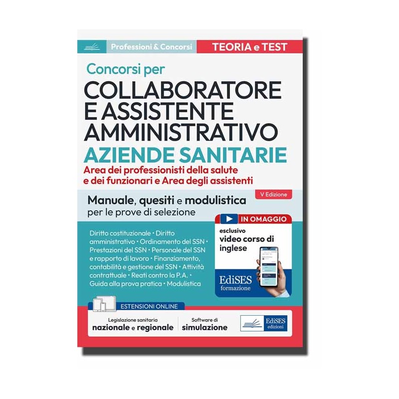 Manuale per la preparazione ai concorsi per Collaboratore e Assistente amministrativo nelle Aziende sanitarie (ASL e Aziende ospedaliere). Il testo comprende tutte le materie oggetto delle prove concorsuali, partendo dalle discipline di base (diritto costituzionale e amministrativo) per poi approfondire le tematiche di area sanitaria (l’ordinamento del servizio sanitario nazionale, le prestazioni erogate, il rapporto di lavoro del personale sanitario, la gestione finanziaria e contabile, l'attività contrattuale). Un'apposita sezione online è, poi, dedicata ai reati contro la Pubblica Amministrazione, la cui conoscenza è spesso richiesta dai bandi di concorso. Il volume è aggiornato alle ultime novità normative rilevanti in materia. Al termine di ogni sezione sono presenti Test a risposta multipla. In appendice è riportata una sintetica guida alla redazione degli atti e una raccolta della modulistica di maggiore utilizzo in ambito sanitario, per affrontare al meglio la prova pratica. In omaggio con il volume il software di simulazione, una raccolta normativa riguardante il settore sanitario e il videocorso completo di lingua inglese dal valore di 60 euro. Libro I - Elementi di diritto costituzionale Libro II - Elementi di diritto amministrativo Libro III - Ordinamento del Servizio Sanitario Nazionale Libro IV - Le prestazioni del Servizio sanitario nazionale Libro V - Il personale del SSN e il rapporto di lavoro Libro VI - Il finanziamento, la contabilità e la gestione del Servizio sanitario nazionale Libro VII - L'attivitàcontrattuale Libro VIII - Diritto penale, limitatamente ai reati contro la PA (estensione online) Appendice - Schemi di atti delle Aziende sanitarie e Guida alla stesura