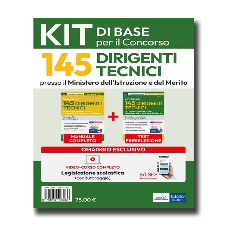 Kit per la preparazione alle prove del concorso 2024-2025 per 145 Dirigenti tecnici. Il pacchetto comprende i seguenti volumi: 27.4 - Manuale del concorso 145 Dirigenti tecnici 27.6 - Test commentati del concorso 145 Dirigenti tecnici - (con software di simulazione) In OMAGGIO con il kit, il video-corso completo di Legislazione scolastica (con slides e tutoraggio) Manuale per la preparazione al concorso per 145 Dirigenti tecnici con funzioni ispettive presso il Ministero dell’Istruzione (già Ispettore scolastico). Il volume comprende le seguenti materie: Competenze giuridiche e amministrative: diritto costituzionale, amministrativo, civile (obbligazioni e contratti, diritto di famiglia), penale (reati contro la P.A. e contro i minori), internazionale e dell'Unione europea (nei settori dell'educazione e dell'istruzione, tutela dei minori) Il pubblico impiego (il personale scolastico, ruolo e compiti della dirigenza tecnica, diritto sindacale, sicurezza nei luoghi di lavoro) Normativa e politiche educative (autonomia dell’istituzione scolastica; inclusione, personalizzazione e individualizzazione degli apprendimenti; ordinamenti scolastici; Sistema nazionale di valutazione, la formazione del personale scolastico, istruzione e formazione superiore e ITS Academy) Contabilità di Stato e ordinamento contabile e finanziario delle scuole Competenze di didattica e sociologia (didattica generale e sociologia generale) Competenze pedagogiche (pedagogia generale e sociale; pedagogia e didattica speciale) Ragionamento verbale e logico astratto (online) Lingua inglese (online) Informatica e competenze digitali (online).Il volume è completato da questionari online per verificare il livello di preparazione raggiunto. Con l'acquisto del manuale avrai accesso anche a una versione light del corso di formazione di Legislazione e normativa scolastica. Pacchetto contenente due libri. Un volume: Concorso per Dirigenti Tecnici con funzioni ispettive presso il Ministero dell'Istruzione e del Merito (Teoria e Test). Secondo volume: Concorso per 145 Dirigenti Tecnici con funzioni ispettive presso il Ministero dell'Istruzione e del Merito (Quesiti Commentati).