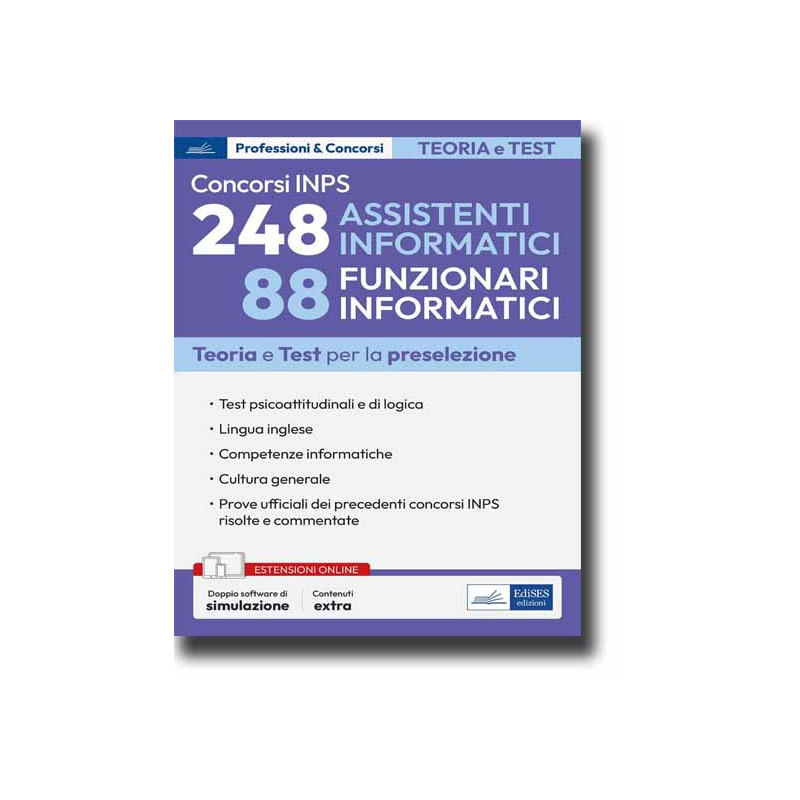 Per ogni argomento sono disponibili quesiti a risposta multipla (online) per verificare le conoscenze acquisite. Due sezioni del volume sono dedicate alla risoluzione e al commento dei quesiti ufficiali dei precedenti concorsi INPS per 967 Consulenti di Protezione Sociale e per 365 Analisti di processo. Tra le estensioni online, è disponibile la sezione dedicata alla risoluzione e al commento dei quesiti ufficiali del concorso 165 Informatici. In omaggio con il libro, il doppio software di simulazione (un software basato su un database di oltre 30.000 quesiti e un software basato sui quesiti ufficiali dei precedenti concorsi) per esercitarsi online (prova la versione demo gratuita)