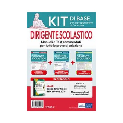 Kit completo per la preparazione a tutte le prove del concorso per Dirigente Scolastico. Il pacchetto comprende i seguenti volumi: Manuale vol. 1 - Competenze giuridiche, amministrative, finanziarie e gestionali del DS; Manuale vol. 2 - Competenze socio-pedagogiche, relazionali e organizzative del DS; Test commentati del concorso per Dirigenti Scolastici. In OMAGGIO con il kit: Ebook La banca dati ufficiale del Concorso 2018 per 2425 Dirigenti scolastici; Mappe concettuali e schemi di sintesi per il ripasso dei contenuti; Software di simulazione della prova preselettiva.