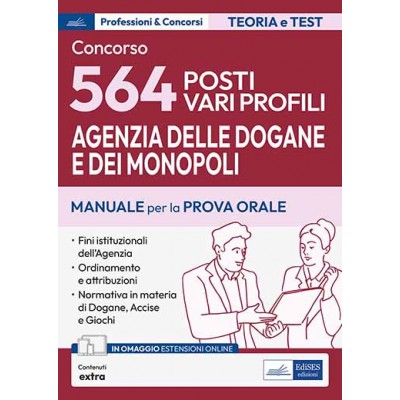 Manuale per la preparazione alla prova orale di tutti i profili indicati nei bandi per il reclutamento di complessivi 564 posti nell’Agenzia delle Dogane e dei Monopoli. Il volume affronta i due argomenti (Fini istituzionali, ordinamento e attribuzioni dell’Agenzia delle dogane e dei monopoli e Cenni di normativa in materia di dogane, accise e giochi) comuni ai diversi profili previsti dai bandi del concorso per 564 posti nell'ADM. Per ciascuna materia, il volume offre una sintesi, ragionata ed esaustiva, di tutto il programma, con aggiornamenti alle più recenti disposizioni normative. Un'appendice normativa raccoglie i principali provvedimenti che interessano l'ordinamento dell'Agenzia e la sua attività (Statuto, regolamento di organizzazione, regolamento di contabilità, Codice doganale). Tra i contenuti web inclusi sono riportati numerosi quesiti di verifica a risposta multipla utili per la verifica dell'apprendimento teorico.