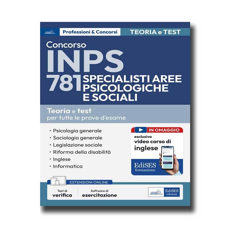 Manuale per la preparazione al concorso per 781 Specialisti Aree Psicologiche e Sociali INPS. Il volume affronta le seguenti materie: Psicologia generale, Sociologia generale, Legislazione sociale e Riforma della disabilità, Inglese (online), Informatica (online). Il volume è aggiornato alla Legge di bilancio per il 2025 e alla Riforma della disabilità di cui al D.Lgs. 3 maggio 2024, n. 62, con specifico riguardo agli aspetti connessi alla valutazione e assistenza delle persone disabili. Per ciascuna delle materie il testo offre una sintesi di tutto il programma, test di verifica a risposta multipla, disponibili fra le estensioni online, che consentono di esercitarsi in vista della prova di selezione. Incluso con l'acquisto del volume il corso di formazione di inglese e il software di esercitazione. Il manuale contiene tutte le materie necessarie per prepararsi al concorso per l'assunzione a tempo indeterminato di